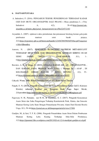 Pineapple is a tropical fruit that decays easily, which means it can not last long only on a room temperature. Furthermore, pineapple contains high level of water, so it is susceptible to decay, wrinkle, mechanical damage, wilt and easily attack by fungi and bacteria. One way to maintain pinapple’s shelf life is by desiccate the pinapples. The purpose of this study was to determine the effect of soaking CaCl2 and sodium metabisulphite with different concentrations in physicochemical properties of dried candied pineapple fruit. Pre-treatment was steam blanching for 3 minutes in a temperature of 85ºC. Subsequently, it was treated with an addition of sodium metabisulfite with 0.15%, and 0.3% soaking concentration and 2% and 3% concentration of CaCl2. The drying method was done in the oven with a temperature of 60ºC until the moisture level was about <25%. Afterwards, a chemical analysis was conducted by measuring the moisture level using the Thermogravimetric method, water activity using the Aw Meter, and pH level using the pH meter. In addition, physical analysis was also conducted by measuring the texture using a texsture analyzer and colors using chromameter. The results showed that the application of soaking pineapple into CaCl2 solution and sodium metabisulphite produced dried candied water content of pineapple <25% which was in accordance with the standard set. The dried candied pineapple has an aw<0.8, it had the potential to prevent mold from growing. The addition of CaCl2 made the texture better. Therefore, the higher the concentration of CaCl2 the better the texture produced and the higher the level of sodium metabisulfite, the better the product color and the brighter. The combination of sodium metabisulfite 0.15% + CaCl2 0.3% produced a good color and texture compared to the controls. The combination of sodium metabisulfite 0.15% + CaCl2 2% and sodium metabisulfite 0.3% + CaCl2 2% produced a pH that was more stable than the control.The application of soaking pineapple into CaCl2 solution and sodium metabisulphite can decrease the value of water activity, but it doesn’t affect pH value. pH value can improve the texture, slightly reduce the value of water activity, and maintain color of the product. The higher the concentration of sodium metabisulphite and CaCl2 will produce a product with a strong texture but easily broken and inhibited browning of the product.
