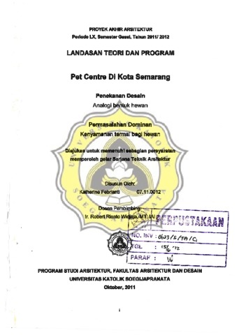 FEBRIANTI, KATHERINE (2011) LTP PET CENTRE DI KOTA SEMARANG Penekanan desain : Analogi bentuk hewan. Other thesis, Unika Soegijapranata Semarang.
