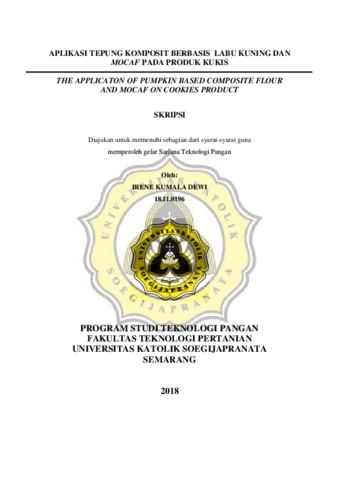 DEWI, IRENE KUMALA (2018) THE APPLICATON OF PUMPKIN BASED COMPOSITE FLOUR AND MOCAF ON COOKIES PRODUCT. Other thesis, UNIKA SOEGIJAPRANATA SEMARANG.