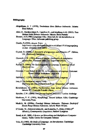 Jargon adalah bagian dari ilmu Sosiolinguistik. Jargon adalah bahasa yang berhungan dengan pekerjaan dan merupakan bahasa yang rahasia., sehingga bahasa itu hanya ada di dalam lingkungan pekerjaan dan hanya orang yang bekerja dalam bidang yang sarna yang daput memahaminya. Penulis menemukan adanya Jargon di percakapan Game Online. Penelitian ini diarahkan untuk menemukan jargon yang digunakan di percakapan Game Online, lalu menganalisanya dari Semantik untuk menemukan arti denotasi dan konotasi, dan dari segi morfologi untuk menemukan proses pembentukan kata. Jadi, penelitian dilakukan di domain Sosiolinguistik, Semantik, dan Morfologi. Penelitian ini termasuk penelitian kualitatif. Data dikump-ulkan dengan mencari di dalam percakapan game online. Dalam hal ini data disahkan oleh para pemain MMORPG, RTS, dan FPS. Penulis menemukan 73 jargon. Penulis menemukan 23 jargon (30%) yang memiliki arti konotasi negatif, 27 (36%) jargon yang memiliki arti konotasi positif, dan 26 (34%) jargon yang memiliki arti netral. For word formation process, there are 30 jargons (40%) with one process, and then 39 jargons (52%) with mUltiple processes, and finally 6 jargons (8%) with no process. Untuk proses pembentukan kata, ada 26 jargon (34%) dengan satu proses, lalu 41 j~rgon (58%) dengan proses ganda, dan yang teFakhir 6 jargon (8%) dengan tidak melalui proses apapun.