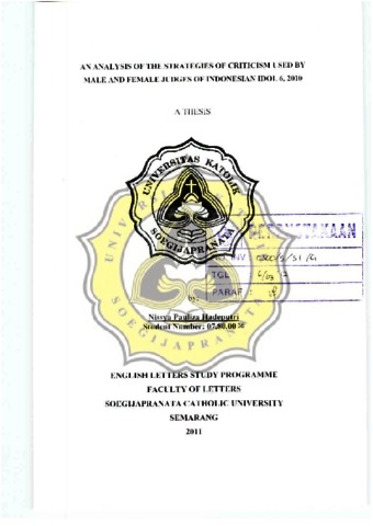 HADEPUTRI, NISSYA PAULIZA (2011) AN ANALYSIS OF THE STRATEGIES OF CRITICISM USED BY MALE AND FEMALE JUDGES OF INDONESIAN IDOL.6, 2010. Other thesis, Unika Soegijapranata Semarang.