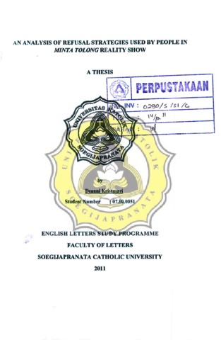 KRISTASARI, DEANNI (2011) AN ANALYSIS OF REFUSAL STRATEGIES USED BY PEOPLE IN MINTA TOLONG REALITY SHOW. Other thesis, Unika Soegijapranata Semarang.