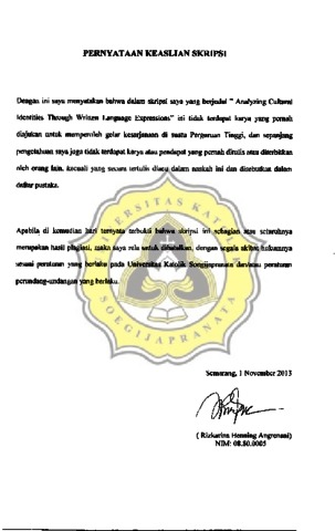 ANGRENANI, RIZKARINA HENNING (2013) ANALYZING CULTURAL IDENTITIES THROUGH WRITTEN LANGUAGE EXPRESSIONS. Other thesis, Unika Soegijapranata Semarang.