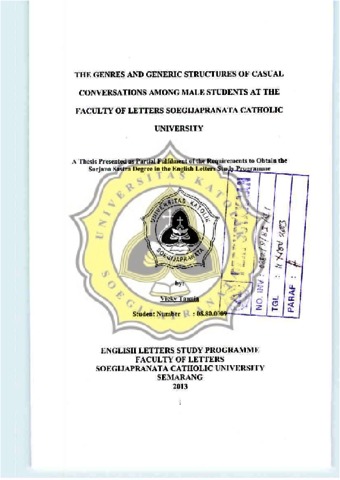 TANIA, VICKY (2013) THE GENRES AND GENERIC STRUCTURES OF CASUAL CONVERSATIONS AMONG MALE STUDENTS AT THE FACULTY OF LETTERS SOEGIJAPRANATA CATHOLIC UNIVERSITY. Other thesis, Unika Soegijapranata Semarang.