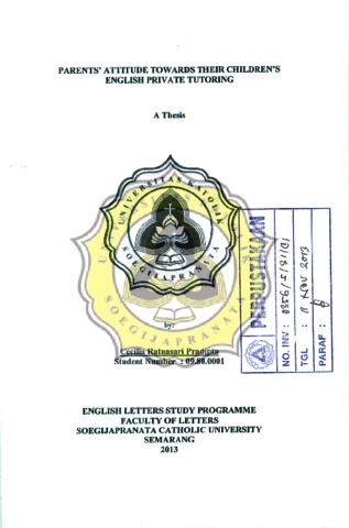 PRADIPTA, CECILIA RATNASARI (2013) PARENTS'ATTITUDE TOWARDS THEIR CHILDREN'S ENGLISH PRIVATE TUTORING. Other thesis, Unika Soegijapranata Semarang.