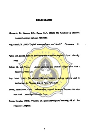 Orang tua adalah panutan and pembuat keputusan di dalam sebuah keluarga. Sikap orang tua sangatJah penting dalam perkembangan anak. Dalam, belajar bahasa Inggris, sikap orang tua adalah salah satu faktor penting yang menentukan kesuksesan dalam bela jar bahasa. Oi dalam penelitian ini, penulis meneliti tentang sikap orang tua terhadap les privat anaknya. Objek pada penelitian ini adalah 33 orang tua yang memperkerjakan guru les privat yang berasal dari mahasiswa Sastra Inggris di UNIKA Soegijapranata untuk mengajar anak mereka bahasa Inggris. Banyak mahasiswa di FaKultas sastra UNIKA Soegijapranata yang menjadi guru les privat. Penulis tertarik untuk mengetahui sikap orang tua terhadap les privat karena walaupun guru les privat yang merupak3n rD8hasiswa tersebut belwn lulus. tapi orang tua percaya kepada mereka untuk mengajar. Untuk menjawab pertanyaan penelitian. penulis menggunakan kuesiner tertutup. Kuesioner dibagikan kepada 33 orang tua yang mepekerjakan guru les privat. Kuesioner ini terdiri daii 14 pertanyaan yang akan di respon oleh para orang tua. Terdapat 5 pilihan respo~ yaitu sangat setuju, setuju, netral, tidak setuju, sangat tidak setuju. Hasil dari penelitian ini menunjukan bahwa sikap orang tua adalah positif. Hal ini terlihat dari kuesioner yang telah dianalisa menggunakan program SPSS. Para orang tua menjawab secara positif hampir di seluruh pertanyaan. Oengan kata l~ bal ini menunjukan bahwa orang fila memiliki sikap positifterhadap les privat bahasa Inggrls anak mereka