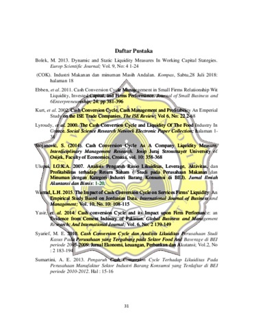 DJUNAEDI, LARAS SARASWATY PUTRI (2019) HUBUNGAN DAN PENGARUH SIKLUS KONVERSI KAS TERHADAP LIKUIDITAS EMITEN BURSA EFEK INDONESIA SUB-SEKTOR MAKANAN DAN MINUMAN. Other thesis, UNIKA SOEGIJAPRANATA SEMARANG.