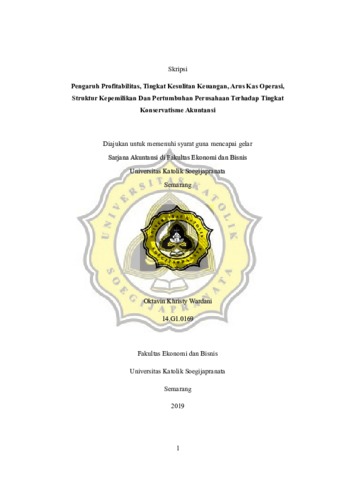 Wardani, Oktavin Khristy (2019) Pengaruh Profitabilitas, Tingkat Kesulitan Keuangan, Arus Kas Operasi, Struktur Kepemilikan Dan Pertumbuhan Perusahaan Terhadap Tingkat Konservatisme Akuntansi. Other thesis, UNIKA SOEGIJAPRANATA SEMARANG.