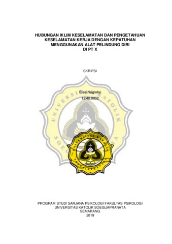 Nugroho, Elisa (2019) HUBUNGAN IKLIM KESELAMATAN DAN PENGETAHUAN KESELAMATAN KERJA DENGAN KEPATUHAN MENGGUNAKAN ALAT PELINDUNG DIRI DI PT X. Other thesis, UNIKA SOEGIJAPRANATA SEMARANG.