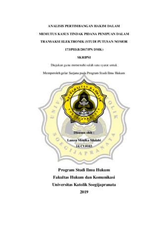 Silalahi, Lamra Monika (2019) ANALISIS PERTIMBANGAN HAKIM DALAM MEMUTUS KASUS TINDAK PIDANA PENIPUAN DALAM TRANSAKSI ELEKTRONIK (STUDI PUTUSAN NOMOR 173/PID.B/2017/PN DMK). Other thesis, UNIKA SOEGIJAPRANATA SEMARANG.