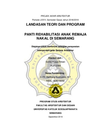 Fitriani, Duhita Puspa (2019) PANTI REHABILITASI ANAK REMAJA NAKAL DI SEMARANG. Other thesis, UNIKA SOEGIJAPRANATA SEMARANG.