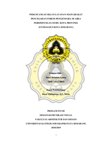 Agung, Hanz Kristian (2019) PERANCANGAN IKLAN LAYANAN MASYARAKAT PENCEGAHAN STRESS PENGENDARA DI AREA PERSIMPANGAN DI IBU KOTA PROVINSI. (STUDI KASUS KOTA SEMARANG). Other thesis, UNIKA SOEGIJAPRANATA SEMARANG.
