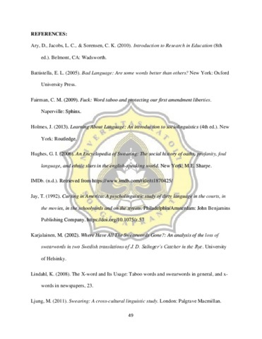 The writer investigates swear words uttered in Mac & Devin Go To High School movie using sociolinguistics approach. The movie that has 1 hour and 15 minutes’ duration starred by Snoop Dogg (Mac Johnson) and Wiz Khalifa (Devin Overstreet) as students of St. Yale School. There are lot of swear words that uttered on each scene in this movie. This research aims to analyze the swear words that are used by characters in the movie, especially to identify the types based on Battistella (2005) and their function based on Andersson and Trudgill (1990) theories. This research use content analysis as a method because the resources come from the film and the script from the film itself. The writer uses the dialog that contain swear words in the form of a table to make this research easier. Some other relevant books used as references to answer problem formulation. Based on this research, the writer found three types of swearwords: epithets, profanity, and vulgarity/obscenity in the movie. Each of swear words uttered by characters on the movie has their function: expletive, abusive, humorous, and auxiliary. The type of swear words are dominated by vulgarity/obscenity and the characters on the movie more often swearing as auxiliary function. There also swear words that are rarely used in general. Meanwhile, the way Mac speaking in the movie became a special concern because He often uttered swear words on his utterances.
