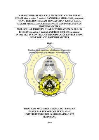 JUMIYATI, JUMIYATI (2019) MOLECULAR PROTEIN CHARACTERIZATION IN BLACK RICE (Oryza sativa L. indica) AND RED RICE (Oryza nivara) INVOLVED IN CONTROL OF BLOOD SUGAR LEVELS USING SDS-PAGE AND BIOINFORMATICS. Other thesis, UNIKA SOEGIJAPRANATA SEMARANG.