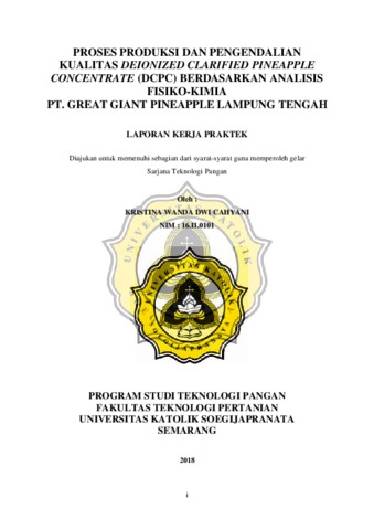CAHYANI, KRISTINA WANDA DWI PROSES PRODUKSI DAN PENGENDALIAN KUALITAS DEIONIZED CLARIFIED PINEAPPLE CONCENTRATE (DCPC) BERDASARKAN ANALISIS FISIKO-KIMIA PT. GREAT GIANT PINEAPPLE LAMPUNG TENGAH. Project Report. Unika Soegijapranata Semarang, Semarang.