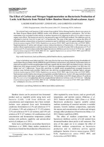 HARTAJANIE, LAKSMI and LINDAYANI, - and SANTOSO, LORENTIA (2018) The Effect Of Carbon and Nitrogen Supplementation on Bacteriocin Production Of Lactic Acid Bacteria From Pickled Yellow Bamboo Shoots (Dendrocalamus Asper). MICROBIOLOGY INDONESIA, 12 (1). pp. 7-14. ISSN 1978-3477