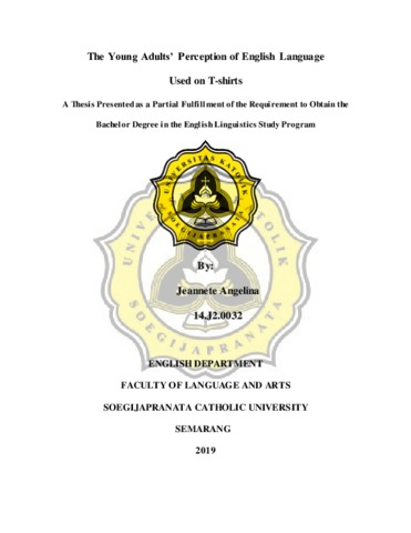 Angelina, Jeannete (2019) The Young Adults’ Perception of English Language Used on T-shirts. Other thesis, UNIKA SOEGIJAPRANATA SEMARANG.