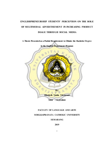 Trisnawati, Elizabeth Yunita (2019) ENGLISHPRENEURSHIP STUDENTS’ PERCEPTION ON THE ROLE OF MULTIMODAL ADVERTISEMENT IN INCREASING PRODUCT IMAGE THROUGH SOCIAL MEDIA. Other thesis, UNIKA SOEGIJAPRANATA SEMARANG.