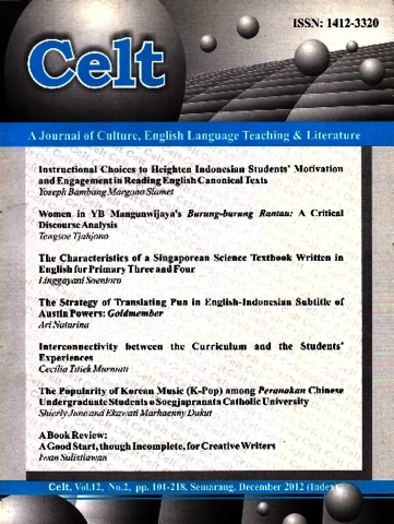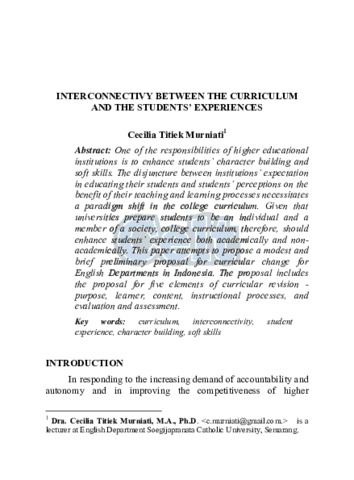 MURNIATI, CECILIA TITIEK (2012) INTERCONNECTIVY BETWEEN THE CURRICULUM AND THE STUDENTS' EXPERIENCES. Celt: A Journal of Culture, English Language Teaching & Literature, 12 (2). pp. 180-192. ISSN 180-192