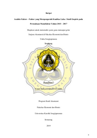 Utomo, Yutaro Satriyo (2019) Analisis Faktor – Faktor yang Mempengaruhi Kualitas Laba : Studi Empiris pada Perusahaan Manufaktur Tahun 2015 – 2017. Other thesis, UNIKA SOEGIJAPRANATA SEMARANG.