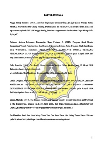 Penggunaan tisu sebagai alat pembersih menjadi gaya hidup terutama masyarakat di perkotaan. Hal ini didukung dengan data meningkatnya perusahaan yang bergerak di bidang kertas dan tisu dari tahun ke tahun. Gaya hidup tersebut disebabkan karena kepraktisan dan efektivitas saat menggunakan tisu yang sangat sesuai dengan berbagai kegiatan masyarakat di perkotaan. Tisu memiliki bahan dasar serat kayu. Dalam pengolahannya hingga menjadi tisu yang layak digunakan, proses nya tentu memiliki dampak yang dapat merusak lingkungan di sekitar. Pemakaian tisu saat ini kerap kali dilakukan oleh masyarakat dengan rentang usia sembilan belas hingga dua puluh dua tahun. Golongan masyarakat ini dikenal dengan istilah generasi millennials yang cenderung menyukai hal-hal yang unik dan baru. Dalam perancangan ini, media yang digunakan adalah unconventional media yang bersifat unik dan tidak biasa. Media ini disesuaikan dan dirasa cocok dengan target sasaran yang merupakan generasi millennials. Kata Kunci : Tisu, Generasi Millennials, Unconventional Media