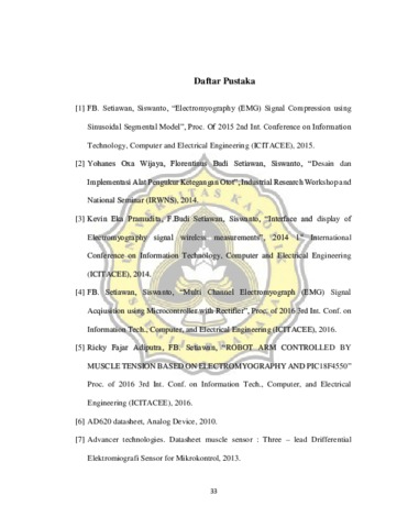 Elektromiografi (EMG) adalah teknik untuk mengevaluasi dan merekan aktivitas listrik yang dihasilkan oleh otot rangka. EMG dilakukan menggunakan alat yang disebut Electromyograph, untuk menghasilkan rekaman yang disebut Elektromiogram, sinyal dapat di analisis untuk mendeteksi kelainan medis, tingkat aktivitas atau untuk menganalisa biomekanik gerakan manusia. Otot digerakan oleh serat otot yang berkontraksi dengan menerima perintah dari otak. Tetapi, energi untuk menggerakan otot terbatas. Jika otot mengalami kekurangan energi, tidak peduli bagaimana serat otot mengirim perintah dari otak, otot pun tidak akan bergerak. Seperti disfungsi sementara pada otot merupakan keadaan kelelahan pada otot. Jika otot mengalami kelelahan, maka akan mengakibatkan penurunan efisiensi kerja. Seiring dengan perkembangan jaman, pengaplikasan ilmu robotika juga semakin berkembang dan mulai masuk ke berbagi bidang, khususnya bidang biomedis yang akan sangat bermanfaat untuk umat manusia untuk kelangsungan hidupnya. Pada tugas akhir ini saya akan membahas tentang perancangan electromiografi (EMG) untuk mendeteksi adanya aktivitas listrik di dalam otot manusia. Untuk mendeteksi adanya aktivitas listrik dalam otot dilakukan analisis terhadap rangkaian penguat sinyal. Karena sinyal ini mempunyai amplitudo yang sangat kecil maka diperlukan elektroda sebagai media untuk mendeteksi sinyal tersebut, elektroda di lekatkan pada bagian otot besar yang mempunyai denyut nadi paling kuat. Kemudian sinyal dikuatkan menggunakan rangkaian penguat AD620 dengan 1000 kali penguatan Kata Kunci : Sensor Elektromiografi , AD620, Elektroda