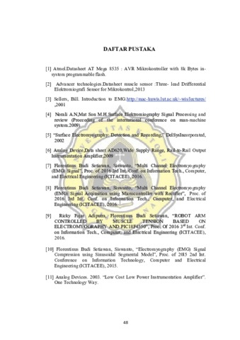 Pada jaman modern ini,Pada dunia teknologi sudah mengalami kemajuan sangat pesat.Diantaranya adalah di bidang biomedis.Di bidang biomedis terdapat alat yang bernama sensor Elektromiografi,yaitu sebuah alat yang dapat membaca sinyal pada otot manusia.Alat ini sangat banyak pengaplikasianya di dunia bio medis.Sensor Elektromiografi,yaitu sebuah alat yang dapat membaca sinyal pada otot manusia,Yang selanjutnya akan diolah sinyalnya untuk menghasilkan sebuah output tertentu. Pada penilitian ini penulis melakukan pembacaan sinyal otot atau Elektromiografi menggunakan sensor Elektromiografi yang di inputkan ke Mikrokontroler AT MEGA 8535 untuk mengendalikan LCD sebagai tampilan dari hasil pengukuran tersebut.Sinyal yang di hasilkan dari prngukuran ini dapat digunakan juga untuk mengendalikan output dalam bentuk lain seperti contoh aplikasinya untuk mengendalikan lengan robot atau mengendalikan output dalam bentuk audio. . Kata Kunci : Elektromiografi ,Mikrikontroler AT MEGA 8535 , LCD