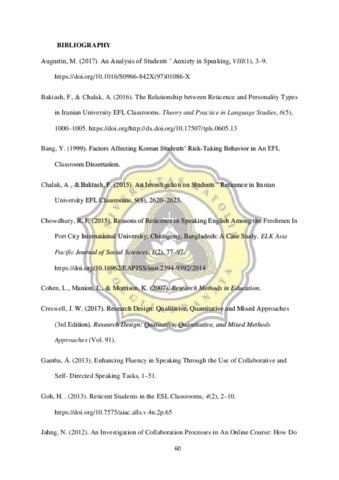 This research focuses on the reticence that the students of the Faculty of Language and Arts in Soegijapranata Catholic University have during the class of Speaking of Group Interaction. The writer felt interested in finding the factors that causes the students to be reticent during the class. This study used quantitative method. The writer used questionnaire given to 57 respondents who are currently joining the class of Speaking for Group Interaction. The writer found that during different class activities, they have different level of reticence. In the daily activities, there were 6 factors that cause the students to be reticent in the class. They are I am nervous when talking, I stumble over my words, I muddle my words, I lose sight of what I want to say when talking, my thoughts are disorganized, and also my thoughts are jumbled. During the mid-test, there were 7 factors that make the students become unwilling to participate. They are I am nervous when talking, I feel tense when talking, I stumble over my words, I forget what I want to say when talking, I lose sight of what I want to say when talking, my thoughts are disorganized, and also my thoughts are jumbled. During the final test, there were 4 factors which cause reticence. They are I am nervous when talking, I feel tense when talking, I stumble over my words, and also I muddle my words.