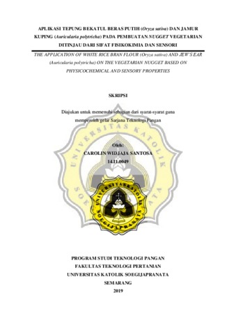 SANTOSA, CAROLIN WIDJAJA (2019) THE APPLICATION OF WHITE RICE BRAN FLOUR (Oryza sativa) AND JEW’S EAR (Auricularia polytricha) ON THE VEGETARIAN NUGGET BASED ON PHYSICOCHEMICAL AND SENSORY PROPERTIES. Other thesis, UNIKA SOEGIJAPRANATA SEMARANG.