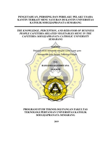 FEBRIYANA, RAMADHANI (2019) THE KNOWLEDGE, PERCEPTION, AND BEHAVIOR OF BUSINESS PEOPLE CAFETERIA RELATED VEGETABLES MENU IN THE CAFETERIA SOEGIJAPRANATA CATHOLIC UNIVERSITY SEMARANG. Other thesis, UNIKA SOEGIJAPRANATA SEMARANG.