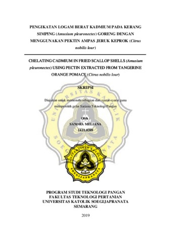 MELIANA, SANDRA (2019) CHELATING CADMIUM IN FRIED SCALLOP SHELLS (Amusium pleuronectes) USING PECTIN EXTRACTED FROM TANGERINE ORANGE POMACE (Citrus nobilis lour). Other thesis, UNIKA SOEGIJAPRANATA SEMARANG.