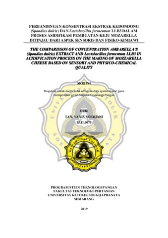 SOERJANI, TAN, VANIA (2019) THE COMPARISSON OF CONCENTRATION AMBARELLA’S (Spondias dulcis) EXTRACT AND Lactobacillus fermentum LLB3 IN ACIDIFICATION PROCESS ON THE MAKING OF MOZZARELLA CHEESE BASED ON SENSORY AND PHYSICO-CHEMICAL QUALITY. Other thesis, UNIKA SOEGIJAPRANATA SEMARANG.