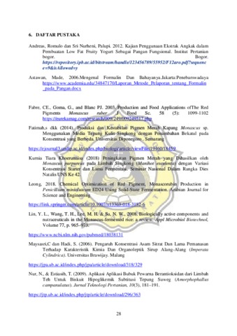 Food coloring agents are divided into 2 groups, namely natural and synthetic coloring agents. In the food industry the use of synthetic coloring agents is more often used. Synthetic dyes are thought to have carcinogenic properties which can trigger cancer cells. Nowdays the change of synthetic dyes to natural products in food is currently increasing. One alternative to the natural red dye that can be utilized is the red pigment in Angkak. The red color of Angkak appears through the fermentation process of rice with the help of Monascus purpureus mold. Syrup is an example of a food product that cannot be separated from the use of coloring agents in the production process. Therefore, the red color on Angkak can be used as a substitute for synthetic dyes that have been used. Red pigments in Angkak (monaskurobin) are stable at alkaline pH and are damaged in acidic conditions. In addition, natural pigments in Angkak are also susceptible to high temperatures. This research needs to be done to find out whether natural red coloring in Angkak can be used as a substitute for synthetic dyes in syrup products. The purpose of this study was to to determine the effect of processing and concentration of citric acid on syrup products by adding natural red coloring powder from Angkak extract. The coloring agent given was extracted powder from Angkak drying method of Cabinet drying with Soy Protein Isolate 5% as an encapsulation agent. In the process of making syrup, pH 3 to 4.7 must be formed to produce smooth gel. In this study, to make an acidic condition citric acid was added with a concentration of 0.5%, 1.0%, and 1.5%. The treatment method for dyeing powder was before the cooking process and after the cooking process. Tests carried out on product were pH, antioxidant activity, color intensity, and quantity of red pigmen, sensory of produc. The results of this study are by increasing the concentration of citric acid reduced pH and increased the antioxidant activity of syrup; and caused a decrease in the stability of the intensity of the red pigment in spectro and croma tests. At the treatment stage the administration of coloring powder before and after cooking, which is when the dye powder is given before cooking means the coloring agent is heated during cooking. Syrup with the treatment of dyeing powder before cooking has better antioxidant activity and red pigment intensity. In the sensory test with an assessment of 40, commercial syrup respondents being the most preferred syrup.