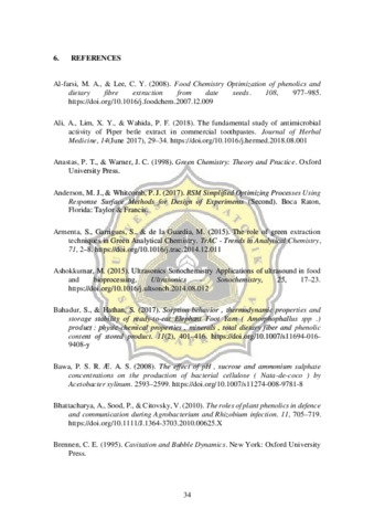 Piper betle Linn., or better known as betel vine is an important plant that is widely grown in South and Southeast Asia. Betel leaves contain numerous phytochemicals which have several health benefits including anti-inflammation, anticancer, antioxidant, antibacterial, antifungus, etc. Due to these highly valuable phytochemicals in betel leaves, extraction of phytochemicals from betel leaves has been thoroughly studied on. Owing to Green Chemistry principles, advanced technologies are being employed to increase the efficiency of phytochemicals extraction from betel leaves. Out of these avant-garde extraction technologies, ultrasound-assisted extraction is considered one of the best method to maximize the yield of phytochemical and at the same time preserve them. Ultrasound wave is defined as a soundwave which has a frequency of over 20 kHz. Ultrasound-assisted extraction, as its name suggests, utilize ultrasound wave to create a series of cavitation that breaks down the cell wall of plants, assisting in the mass transfer of the solutes from inside the plant to the solvent. In this study, the extraction factors studied were waterbath temperature, extraction time, and sonication power; with the aim of optimizing these factors to obtain highest total phenol value. Since polyphenolic content in betel leaves is responsible for the antioxidant activity of the leaf’s extract, the antioxidant activity of the crude extract was also studied on. The betel leaves were dried at 50oC at 0.5 atm for 6 hours in a vacuum dryer and then ground and sifted through mesh number 30 prior to extraction. The solvent used was 96% ethanol with leaves to solvent ratio of 1:30 (wv-1). Ultrasound bath working at 45 kHz was used in the experimental stage. Each factor was set at 3 treatment levels; extraction time of 20, 25, 30 minutes, waterbath temperature of 45, 50, 55oC, sonication power of 50, 70, 90 Watt. The optimization of extraction parameters was done using response surface methodology, particularly central composite design. The experimental data was analyzed using JMP pro 13 as the statistical tool. The result showed that the most optimum extraction conditions are: extraction time of 27.55 minutes, temperature of 55oC, and sonication power of 73.04 Watt. The statistical result showed that extraction time and temperature are significant factors in the extraction of polyphenolic compounds in betel leaves while sonication power is an insignificant factor. At high extraction conditions (time= 30 minutes, temperature of 55oC, and power of 90 Watt) the amount of polyphenolic compound and subsequently, the antioxidant activity decreased. While the general trend showed that with increasing time and temperature, the amount of total phenolic content extracted also increased, at high extraction conditions there seemed to be degradation of some polyphenolic compounds. In the future, this study can be improved by conducting a onefactor trial runs prior to engaging in the main experimental run so as to screen for any insignificant factors and to find the best range of treatments.