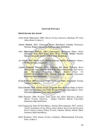 Carolina, Eunike Patricia (2019) AKIBAT HUKUM PENETAPAN PENGADILAN MENGENAI STATUS KEADAAN TIDAK HADIR TERHADAP PEWARISAN STUDI KASUS DI PENGADILAN NEGERI TEGAL. Other thesis, UNIKA SOEGIJAPRANATA SEMARANG.