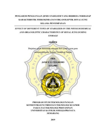 SATIOGROHO, JANICE (2019) EFFECT OF DIFFERENT TYPES OF STABILIZER ON THE PHYSICOCHEMICAL AND ORGANOLEPTIC CHARACTERISTICS OF ROYAL ICING DURING STORAGE. Other thesis, UNIKA SOEGIJAPRANATA SEMARANG.