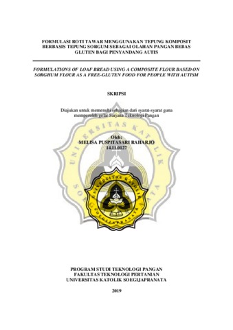RAHARJO, MELISA PUSPITASARI (2019) FORMULATIONS OF LOAF BREAD USING A COMPOSITE FLOUR BASED ON SORGHUM FLOUR AS A FREE-GLUTEN FOOD FOR PEOPLE WITH AUTISM. Other thesis, UNIKA SOEGIJAPRANATA SEMARANG.