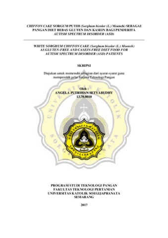 SETYABUDHY, ANGELA PUTRIHAN (2017) CHIFFON CAKE SORGUM PUTIH (sorghum bicolor (L) moench) SEBAGAI PANGAN DIET BEBAS GLUTEN DAN KASEIN BAGI PENDERITA AUTISM SPECTRUM DISORDER (ASD). Other thesis, Unika Soegijapranata Semarang.