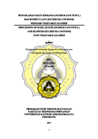 WUNING, SRI (2017) PENGOLAHAN DAUN KEMANGI (OCIMUM SANCTUM L) DAN RUMPUT LAUT (EUCHEUMA COTTONII) MENJADI VEGETABLE LEATHER. Other thesis, Unika Soegijapranata Semarang.