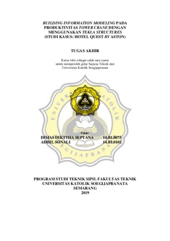 SEPTANA, DIMAS DIKTTHA (2019) BUILDING INFORMATION MODELING PADA PRODUKTIVITAS TOWER CRANE DENGAN MENGGUNAKAN TEKLA STRUCTURES. Other thesis, UNIKA SOEGIJAPRANATA SEMARANG.