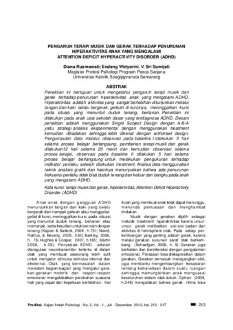 Rusmawati, Diana and Widyorini, Endang and SUMIJATI, SRI PENGARUH TERAPI MUSIK DAN GERAK TERHADAP PENURUNAN HIPERAKTIVITAS ANAK YANG MENGALAMI ATTENTION DEFICIT HYPERACTIVITY DISORDER (ADHD). Prediksi Kajian Ilmiah Psikologi.