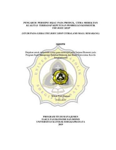 Hapsari, Wikan Putri (2019) PENGARUH PERSEPSI HIJAU PADA PRODUK, CITRA MEREK DAN KUALITAS TERHADAP KEPUTUSAN PEMBELIAN KOSMESTIK THE BODY SHOP. (STUDI PADA GERAI THE BODY SHOP CITRALAND MALL SEMARANG). Other thesis, UNIKA SOEGIJAPRANATA SEMARANG.
