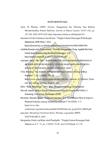 Penelitian ini bertujuan untuk mengetahui apakah faktor gender berpengaruh positif terhadap tingkat literasi keuangan mahasiswa akuntansi, untuk mengetahui apakah faktor usia berpengaruh positif terhadap tingkat literasi keuangan mahasiswa akuntansi, untuk mengetahui apakah faktor pendidikan berpengaruh positif terhadap tingkat literasi keuangan mahasiswa akuntansi, untuk mengetahui apakah faktor passion berpengaruh positif terhadap tingkat literasi keuangan mahasiswa akuntansi. Teknik analisis data menggunakan analisis regresi. Berdasarkan hasil analisis dan pembahasan tentang pengaruh gender, usia, pendidikan dan passion terhadap literasi keuangan, maka dapat ditarik beberapa kesimpulan yaitu Gender berpengaruh terhadap literasi keuangan, usia tidak berpengaruh terhadap literasi keuangan, pendidikan berpengaruh terhadap literasi keuangan, passion berpengaruh terhadap literasi keuangan.