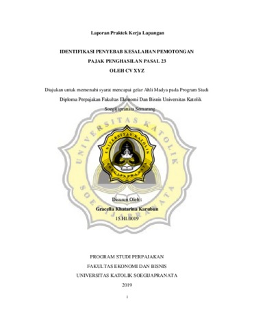 Karubun, Gracella Khatarina (2019) IDENTIFIKASI PENYEBAB KESALAHAN PEMOTONGAN PAJAK PENGHASILAN PASAL 23 OLEH CV XYZ. Project Report. Fakultas Ekonomi Dan Bisnis, Semarang. (Unpublished)