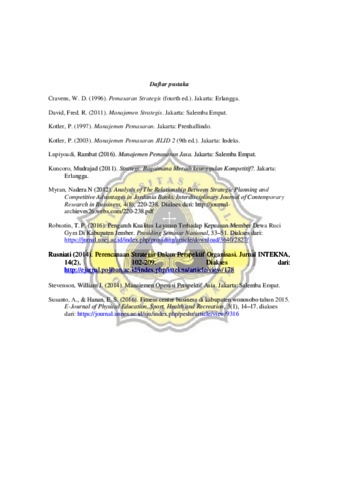 Persaingan di era perdagangan dunia kini mulai masuk ke Indonesia. Globalisasi pasar menciptakan sebuah persaingan antar seluruh bisnis. Sebuah perusahaan harus dapat melewati lingkungan persaingan. Semakin baik perencanaan strategis dilakukan maka perusahaan akan memiliki keunggulan bersaing yang lebih baik. Salah satu bisnis yang berkembang dengan pesat di Semarang adalah bisnis jasa kebugaran tubuh. Pemilihan tempat kebugaran dipengaruhi oleh citra perusahaan, fasilitas dan pelayanan dari Fitness Center. Terpenuhinya kebutuhan anggota fitness berkaitan erat dengan keputusan pelanggan dan menjadi tolak ukur dalam keberhasilan dalam bisnis fitness center. Kondisi seperti ini menuntut perusahaan untuk dapat meningkatkan daya saing dan bertahan ditengah persaingan Fitness Center. Salah satu contoh Fitness Center yang saat ini sedang berkembang di Semarang adalah Oryza Gym Fitness Center. Penelitian ini dibuat untuk dapat membuat perencanaan strategi di bidang pemasaran dan operasional yang berfokus utama pada mengembangkan produk untuk dapat bersaing. Obyek penelitian ini adalah Oryza Gym Fitness Center. Oryza Gym berlokasi di Ruko Setiabudi No.4 Jl. Kyai Mojo Semarang. Metode yang digunakan adalah IE matriks. Hasil penelitian adalah pada fungsi manajemen pemasaran yaitu: menambah jumlah variasi kelas berupa kela Yoga, TRX dan Zumba dengan strategi bekerja sama dengan manajemen sanggar yang berpotensi baik; meningkatkan kualitas peralatan dengan strategi melakukan pemeliharaan peralatan fitness dan penambahan alat baru jika diperlukan; mengaktifkan kembali Healthy Cafe dengan strategi bekerja sama dengan suplier bahan baku dan melakukan rekruitmen SDM. Pada fungsi manajemen operasional yaitu: menyempurnakan sistem program operasional perusahaan, meningkatkan kualitas peralatan dan ruang fitness. menyediakan ruangan, peralatan dan kebutuhan variasi kelas baru, menyediakan kebutuhan Healthy Café.