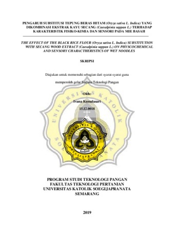 Kumalasari, Ivana (2019) PENGARUH SUBSTITUSI TEPUNG BERAS HITAM (Oryza sativa L. Indica) YANG DIKOMBINASI EKSTRAK KAYU SECANG (Caesalpinia sappan L.) TERHADAP KARAKTERISTIK FISIKO-KIMIA DAN SENSORI PADA MIE BASAH. THE EFFECT OF THE BLACK RICE FLOUR (Oryza sativa L. Indica) SUBSTITUTION WITH SECANG WOOD EXTRACT (Caesalpinia sappan L.) ON PHYSCOCHEMICAL AND SENSORY CHARACTHERISTICS OF WET NOODLES. Other thesis, UNIKA SOEGIJAPRANATA SEMARANG.