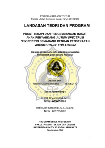 Autism spectrum disorder merupakan gangguan perkembangan yang kompleks menyangkut komunikasi, interaksi sosial, dan aktivitas imajinasi. Diperlukan penanganan khusus berupa berbagai macam terapi yang dilakukan oleh para ahli praktisi kepada anak penyandang ASD. Penanganan tersebut harus dimulai sedini mungkin setelah diagnosis, perawatan yang tepat dapat membantu mereka dalam memperbaiki dan meningkatkan kualitas hidup. Namun, penyediaan fasilitas terapi ini tidak diseimbangi dengan peningkatan jumlah anak penyandang ASD di Indonesia terutama di Kota Semarang yang terus bertambah. Penanganan autisme yang sudah ada umumnya ialah tempat terapi yang bangunannya merupakan alih fungsi dari rumah hunian. Dibutuhkan perencanaan dan perancangan yang tepat menginat user dari fungsi bangunan ini memiliki karakteristik khusus dalam berperilaku. Perancangan bangunan ini dilakukan dengan pendekatan architecture for autism, yang merupakan hasil penelitian khusus yang dilakukan oleh Magda Mustofa. Hasil penelitian tersebut ialah terdapat 7 aspek yang harus diperhatikan dalam mendesain untuk anak penyandang ASD, yaitu akustik, rangkaian spasial, ruang menyendiri, pemisahan ruang, zona transisi, zona sensorik, dan keamanan. Pendekatan ini mengorganisasikan ruangan bedasarkan zoning stimulasi yang diberikan kepada anak penyandang ASD dalam bentuk spasial interior maupun eksterior untuk menstimulasi navigasi anak yang dibagi menjadi 3 zona yaitu low zone, mid zone, dan high zone stimulant. Selain itu, terdapat zona transisi yang berfungsi sebagai jembatan untuk membantu penyesuaian perpindahan zona tersebut yang dibagi menjadi 3 yaitu area transisi I, area transisi II, dan area transisi III. Pendekatan ini juga mengolah persyaratan ruang yang muncul dari karakteristik khusus yang dimiliki anak penyandang ASD.