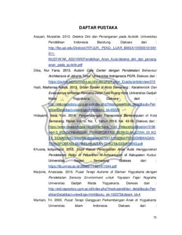 Raharja, Andini Kusuma (2019) PUSAT TERAPI DAN PENGEMBANGAN BAKAT ANAK PENYANDANG AUTISM SPECTRUM DISORDER DI SEMARANG DENGAN PENDEKATAN ARCHITECTURE FOR AUTISM. Other thesis, UNIKA SOEGIJAPRANATA SEMARANG.