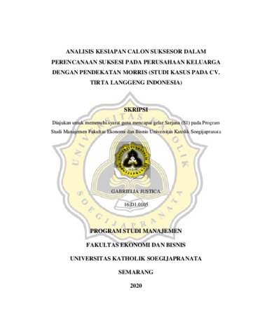 JUSTICA, GABRIELIA (2020) ANALISIS KESIAPAN CALON SUKSESOR DALAM PERENCANAAN SUKSESI PADA PERUSAHAAN KELUARGA DENGAN PENDEKATAN MORRIS (STUDI KASUS PADA CV. TIRTA LANGGENG INDONESIA). Other thesis, Unika Soegijapranata Semarang.