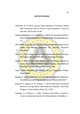 Penelitian ini bertujuan untuk mengetahui pengaruh metode video modeling terhadap peningkatan keterampilan sosial pada anak dengan disabilitas intelektual. Desain penelitian menggunakan single case design dengan metode AB- A. Metode video modeling diberikan pada tiga orang subjek yang berusia kurang dari 12 tahun dengan diagnosa disabilitas intelektual ringan. Guna menentukan keterampilan sosial yang muncul, peneliti menggunakan skala rating sebagai alat pengumpulan data. Aspek-aspek keterampilan sosial yang terdapat pada skala rating antara lain perilaku berbagi, bekerjasama, sabar menunggu giliran dan bergabung dengan teman lainnya. Analisa data menggunakan metode deskriptif dengan analisa grafik serta uji statistik menggunakan Wilcoxon Signed Rank. Hasil perhitungan dengan menggunakan Wilcoxon Signed Rank menunjukkan adanya peningkatan keterampilan sosial setelah mendapatkan intervensi dengan metode video modeling (Z score = -1,841, p = 0,033, dengan signifikansi p<0,05). peningkatan skor tertinggi muncul pada aspek perilaku kerjasama yakni mendapatkan mean skor pretest sebesar 3 dan mean skor posttest sebesar 5,33 sedangkan peningkatan skor terendah muncul pada aspek perilaku berbagi yakni mendapatkan mean skor pretest sebesar 3,67 dan mean skor posttest sebesar 4,33.
